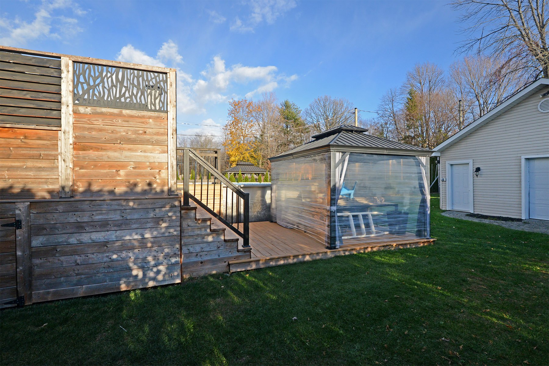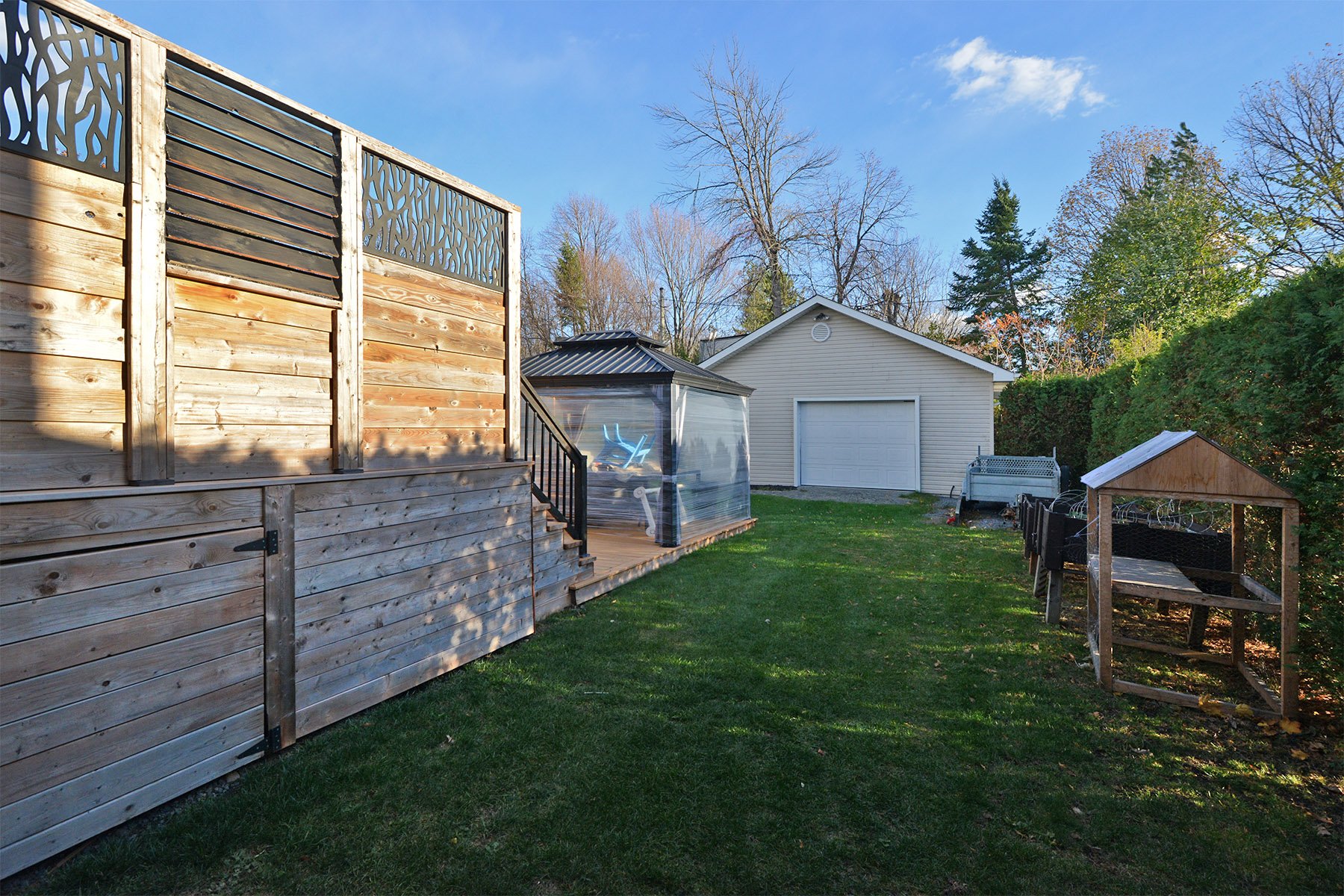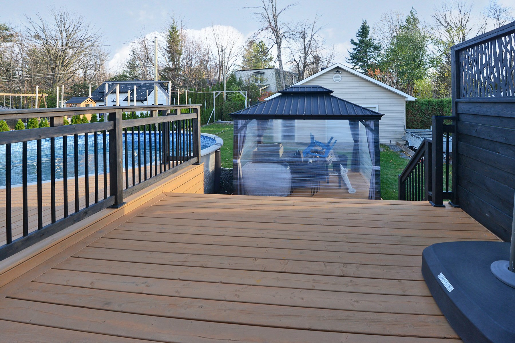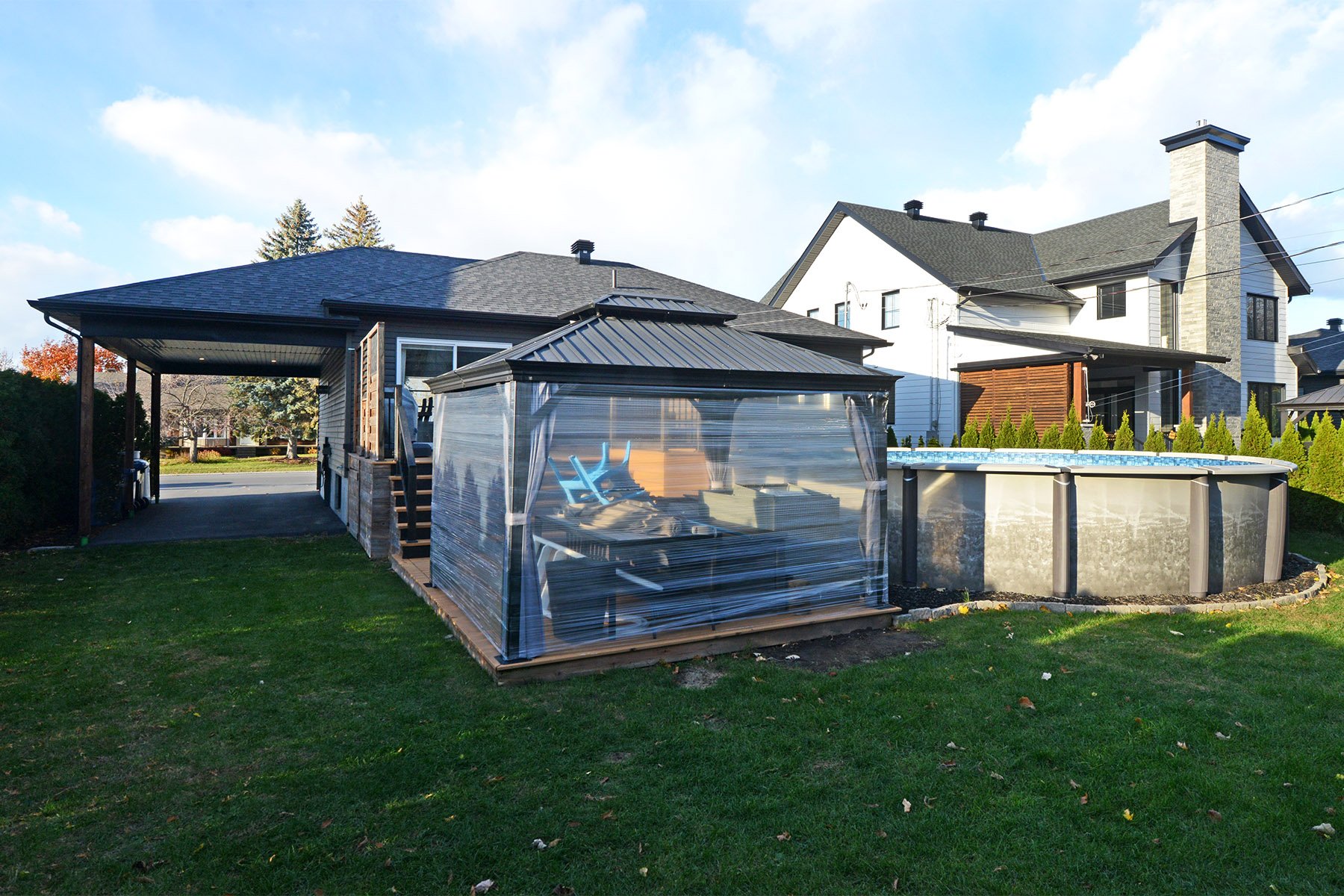 | Inclusions | Luminaires, stores, rideaux, hotte micro-onde, aspirateur central et acc., abri-soleil, piscine et acc., |